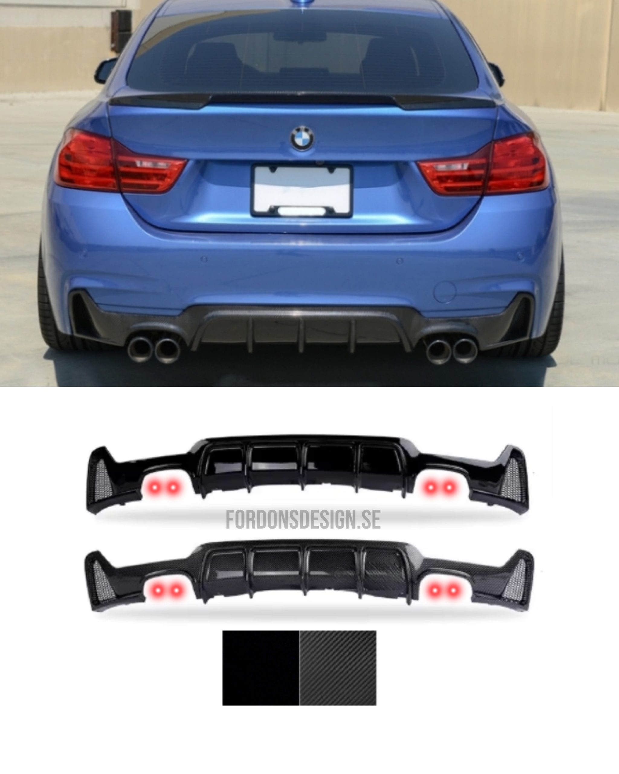 Ge din BMW 4-serie ett mer aggressivt och sportigt bakparti med denna stilrena diffusor, tillgänglig i blanksvart eller kolfiber-look. Designad för att smälta in perfekt med bilens linjer och förstärka det sportiga uttrycket utan att bli överdrivet.
